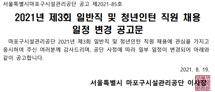 제목 | 2021년 제3회 일반직 및 청년인턴 직원 채용 일정변경 공고 | |||||