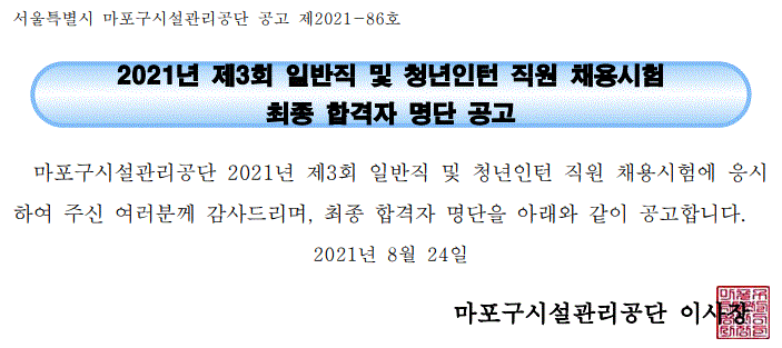 제목 | 2021년 제3회 일반직 및 청년인턴 직원 채용시험 최종 합격자 명단 공고 | |||||