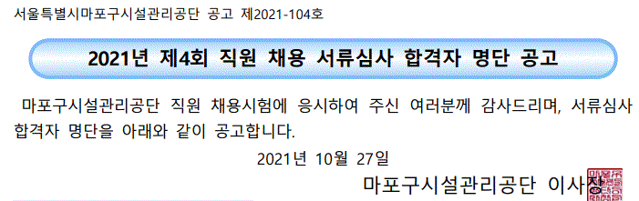 제목 | 2021년 제4회 서류심사 합격자 공고문 | |||||