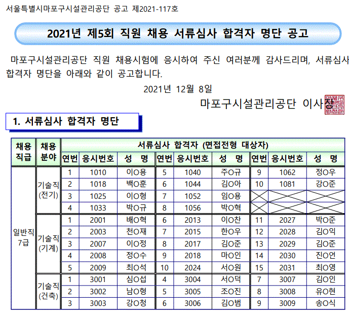 제목 | 2021년 제5회 서류심사 합격자 공고문 | |||||