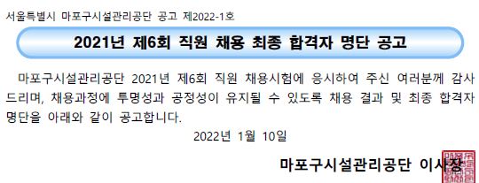 제목 | 2021년 제6회 직원 채용 최종 합격자 명단 공고 | |||||