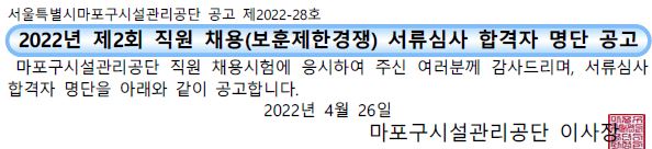 제목 | 2022년 제2회 서류심사 합격자 공고 | |||||