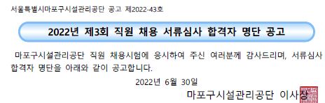 제목 | 2022년 제3회 서류심사 합격자 공고 | |||||