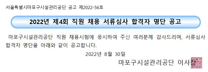 제목 | 2022년 제4회 서류심사 합격자 공고 | |||||