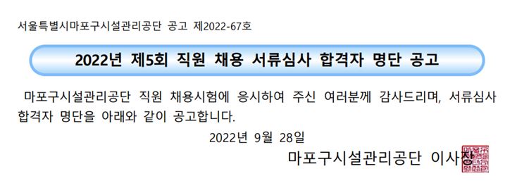 제목 | 2022년 제5회 서류심사 합격자 공고 | |||||