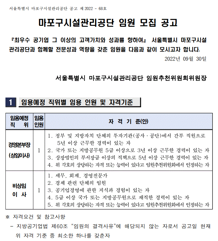 마포구시설관리공단 임원 모집 공고