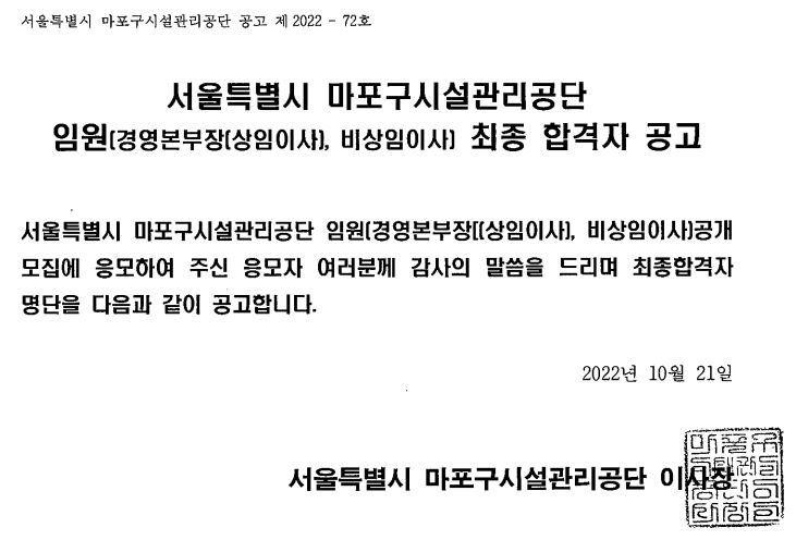 제목 | 마포구시설관리공단 임원 최종 합격자 공고 | |||||