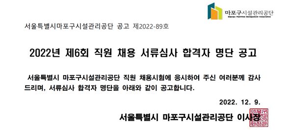 제목 | 2022년 제6회 채용 서류심사 합격자 공고 | |||||