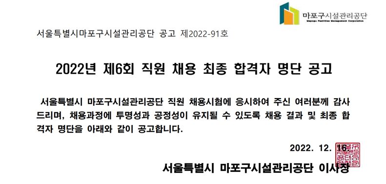제목 | 2022년 제6회 직원 채용 최종 합격자 명단 공고 | |||||