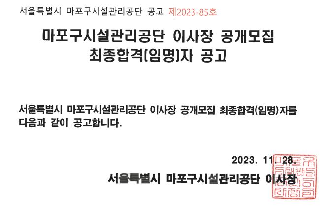 제목 | 마포구시설관리공단 이사장 공개모집 최종합격(임명)자 공고 | |||||