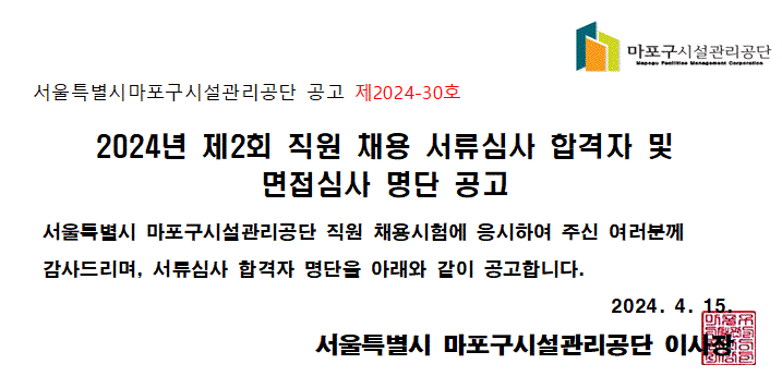 제목 | 2024년 제2회 직원 채용 서류심사 합격자 및 면접심사 명단 공고 | |||||