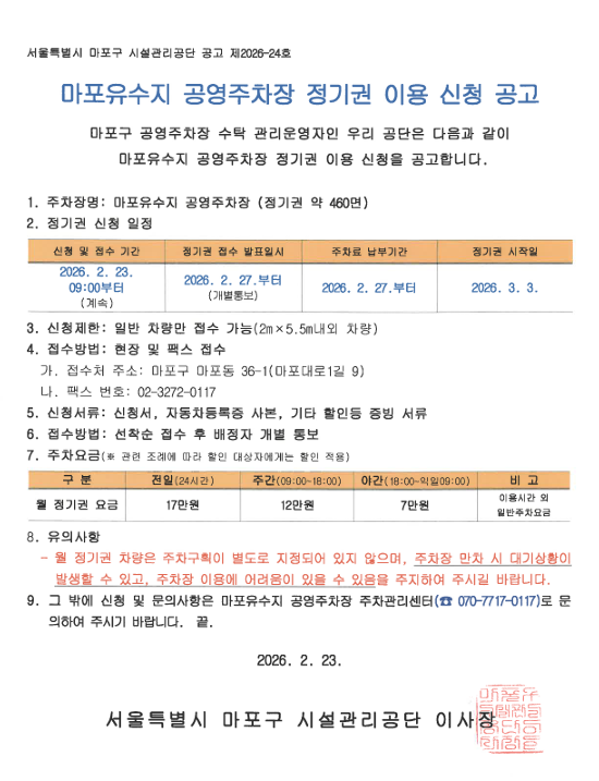 | 제목 | 마포유수지 공영주차장 정기권 이용 신청 공고 | |||||