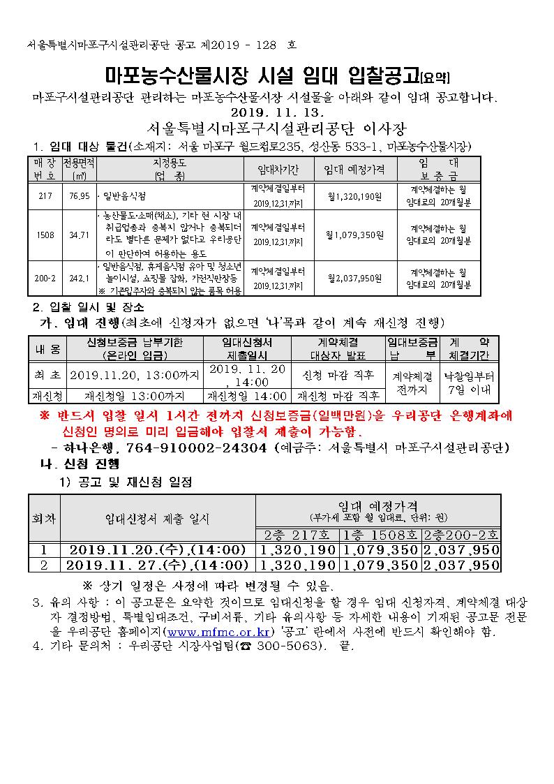 제목 | 마포농수산물시장 공실매장(217호, 1508호,200-2호) 임대 공고 | |||||