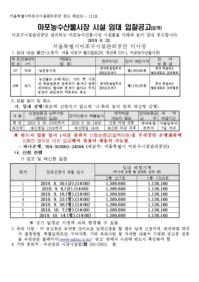 제목 | 마포농수산물시장 공실매장(217호, 1508호) 임대 공고 | |||||