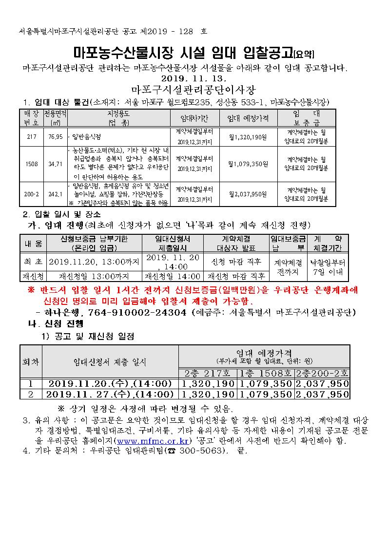 제목 | 마포농수산물시장 공실매장(217호, 1508호,200-2호) 임대 공고 | |||||