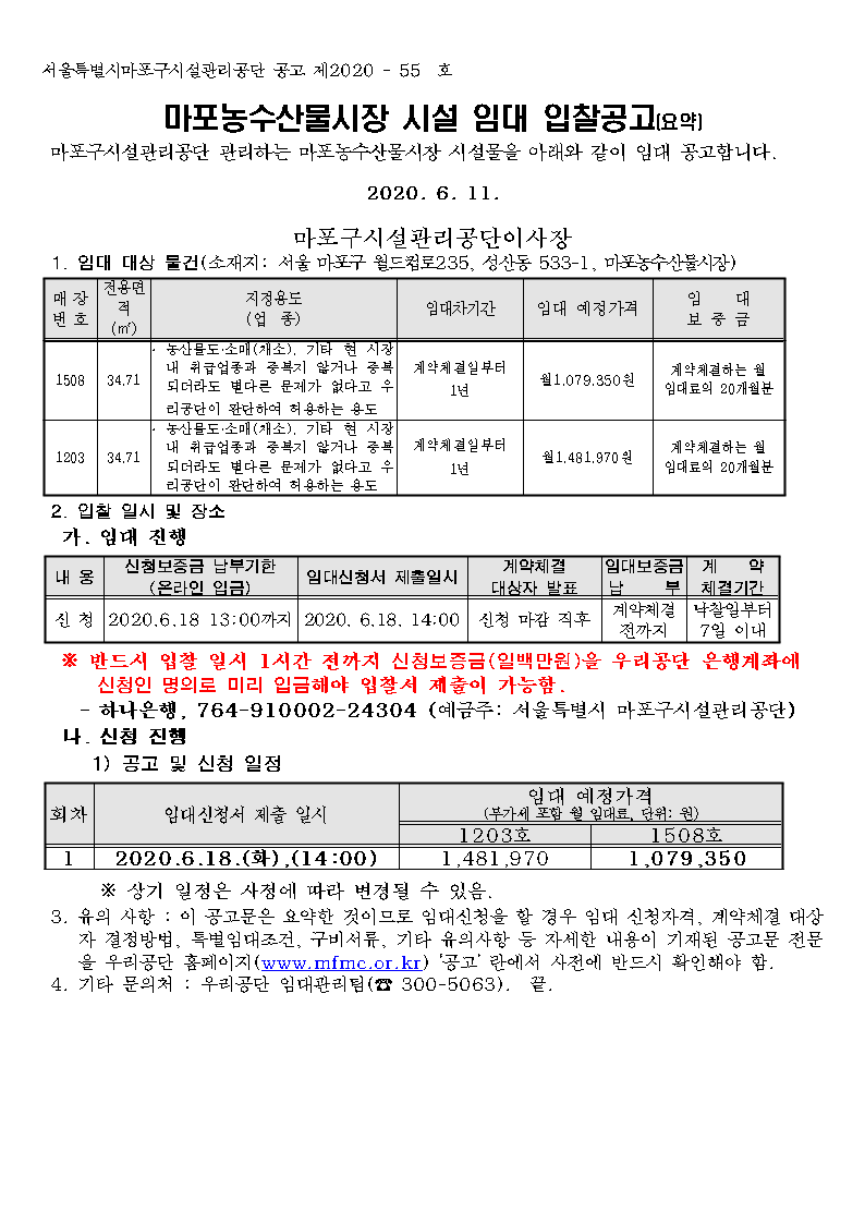 제목 | 마포농수산물시장 매장 임대공고(1203호, 1508호) | |||||