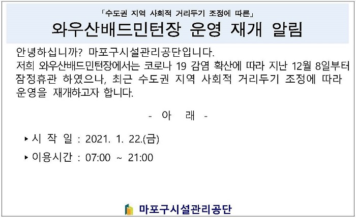제목 | 와우산배드민턴장 운영 재개 및 이용안내 알림 | |||||