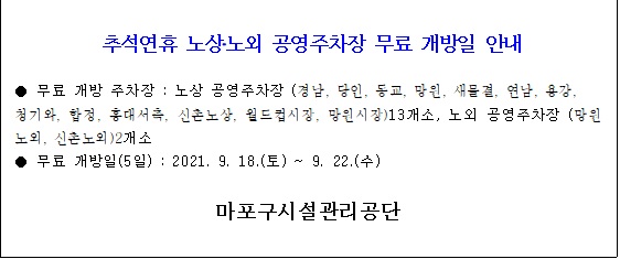 추석연휴 노상 노외 공영주차장 무료 개방일 안내