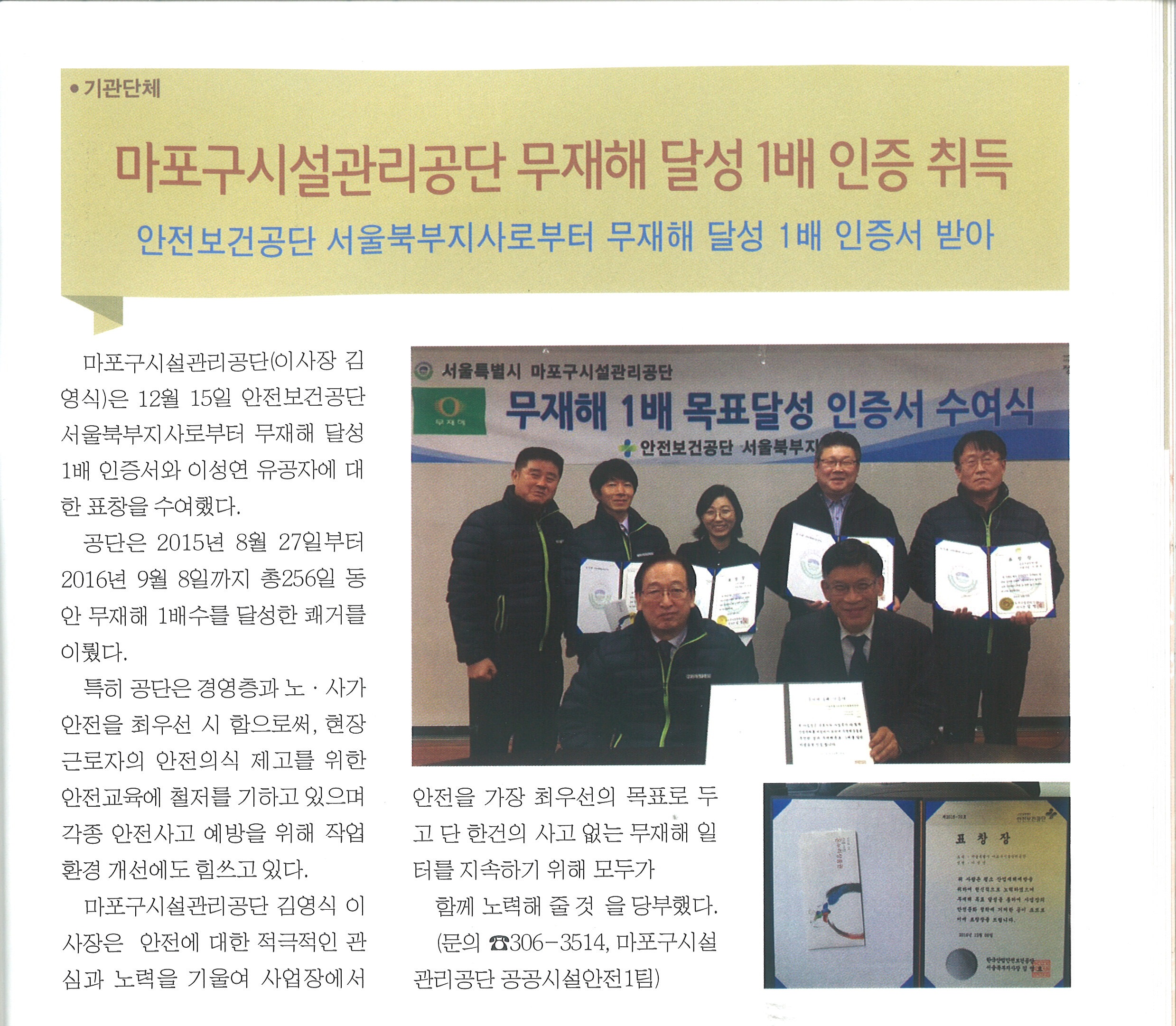 마포구시설관리공단 무재해 달성 1배 인증 취득
