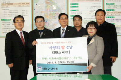 민족 대명절인 설을 맞아 마포구 관내 불우이웃을 위한 ‘2015년 설맞이 사랑의 쌀 나눔 행사’를 가졌다. 먼저 어려운 주민을 돕기 위하여 신수동주민센터에 백미 20킬로그램 40포를 전달하였고, 소외된 다문화 가정을 돕기 위하여 사단법인 에이트참밍에 백미 20킬로그램 10포를 전달하였다. |