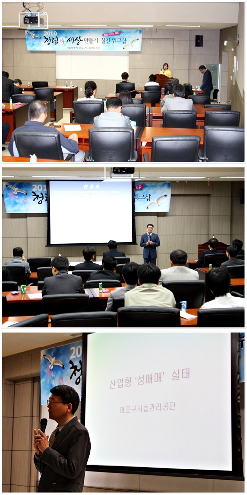 반부패, 윤리 청렴의 지표를 만들다 마포구시설관리공단, 청렴한 세상 만들기 실천 워크샵 열어 ■ 마포구시설관리공단(이사장 김평전)은 10월 18일 마포구청 4층 시청각실에서 윤리·청렴교육의 일환으로 ‘2010년 청렴한 세상만들기 실천 워크샵’을 실시했다. ■ 이번 교육은 지난 8월 17일 새로 취임한 김문태 상임이사의 메시지를 시작으로 사단법인 한국윤리전략연구원 청렴/윤리교육센터 한창희 소장의 ‘청렴한 세상 만들기 실천 워크샵’과 공단의 성희롱 예방교육 전문 강사인 윤주동과장의 ‘성희롱 및 성매매예방 교육’으로 이루어 졌다. ■ 이날 김문태 상임이사는 공공기관의 청렴도 향상의 문제는 그 기관의 존립과 직결될 뿐만 아니라 발전을 위해서도 가장 중요한 문제라며 청렴한 세상을 위하여 전 직원이 힘을 합쳐야 한다고 강조했다. ■ 현재 국민권익위원회의 청렴 교육 전문교수로 활동하고 있는 한창희 소장은 보통 ‘청렴’이라고 하면 거창하고 큰 일이라고 생각하지만, 작고 사소한 부분을 한사람 한사람이 실천하면 그것이 곧 다른 사람에게도 영향을 미쳐 결국은 기관 전체의 청렴도 향상으로 직결된다고 하면서 화장실 사용의 비유를 들어 사소한 것부터 실천하는 것이 중요하다고 역설했다. 그는 “어떤 사람이 깨끗하게 화장실을 사용하는 모습을 본다면, 다음 사람은 더럽게 사용하지 않습니다. 청렴은 규정과 틀로 묶는 것이 아니라 스스로 행동할 수 있도록 서로가 서로에게 모범이 되는 모습을 보여주는 것이 중요합니다.” 라면서 이번 워크샵의 핵심 키워드는 바로 ‘사소한 실천의 중요성’이라고 전했다. ■ 성희롱·성매매 예방교육 시간에는 ‘산업형 성매매의 실태와 처벌’ 등에 관한 내용을 주된 내용으로 하여 윤주동 과장이 강의를 진행했다. 이날 교육에 참석한 직원은 “산업형 성매매 실태를 보니 이제는 불법행위가 점점 지능적으로 변해간다는 것을 알았다.”면서 개개인에게 보다 적극적인 성매매방지 노력이 필요하다고 말했다. ■ 한편 마포구시설관리공단은 정기 내부교육 후 실시되는 설문조사를 통해 차후 교육의 프로그램을 구상하고, 직원 제안제도의 활성화로 교육과 관련하여 채택된 제안을 빠르게 실행하고 있어 직원들의 교육 괌심도와 참여율을 높이고 교육이수제를 통하여 내·외부 교육을 체계적으로 실시하고 있다. |