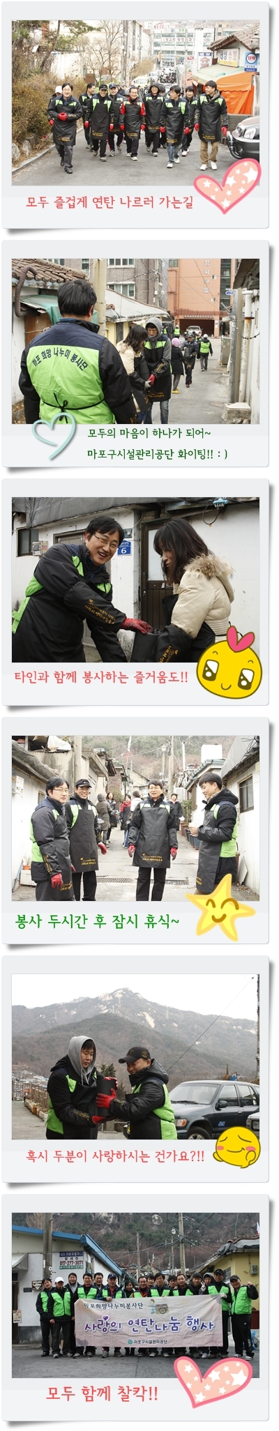 우리 모두 한마음으로~!! 공단 임직원은 지난 12월 4일 ‘사단법인 따뜻한 한반도 사랑의 연탄나눔 운동본부’주관으로 실시된 ‘사랑의 연탄나눔’ 운동에 참여해 상계 3,4동 일대에서 8세대 3천여 장의 연탄을 나누었습니다. |