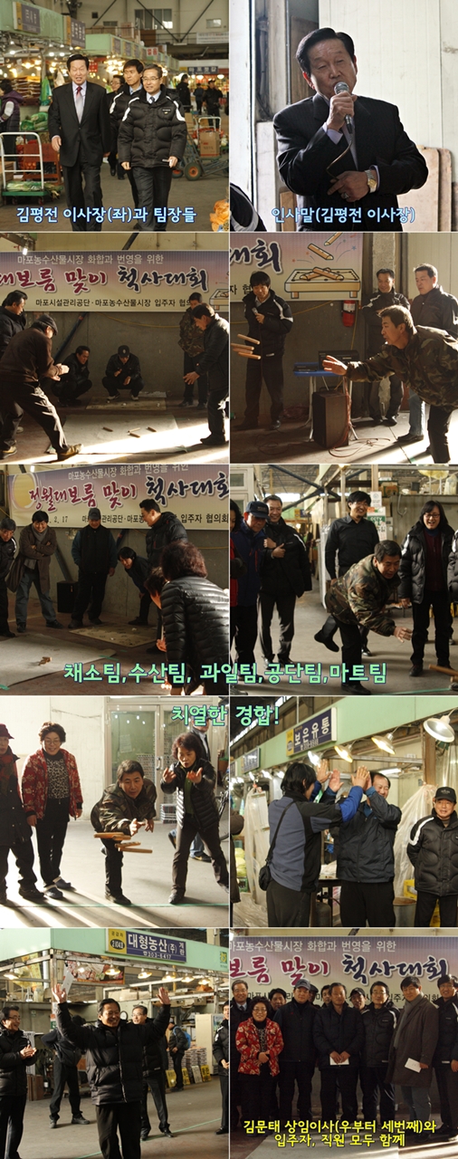 _ 마포구시설관리공단(이사장 김평전)은 마포농수산물시장의 번영과 활성화를 위하여 2월 17일 마포농수산물 시장 내에서 명절대보름맞이 척사대회를 개최하였다. 수산과 채소 매장에서 각 2개 팀씩, 과일매장과 다농마트, 공단에서 각 1개 팀씩 총 7개 팀이 참가하여 토너먼트 형식으로 진행되었고, 채소팀이 우승을 차지하였다. _ |
