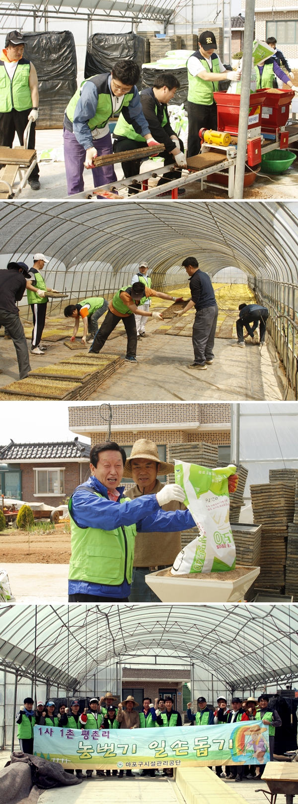 _ 공단 임직원 30여명은 지난 22일부터 23일까지 이틀에 걸쳐 충남 예산군 삽교읍 평촌리 마을에서 농번기 일손돕기 봉사활동을 실시했다. 우리공단은 2008년 충남 예산군 평촌리 마을과 1사1촌 자매 결연을 맺은 이후 매년 봄철 벼 파종, 모판 깔기, 마을 공공시설물 안전 점검 및 기술지원 봉사 활동 등을 펼쳐왔다. 공단과 농촌 마을 간의 이와 같은 자매결연은 농촌의 봄철 일손부족 문제를 해결하는데 동참하여 농업의 가치와 중요성을 함께 인식하고 도농이 공존할 수 있는 방법을 찾아가자는 의미로 시행된 것이다. 우리 공단은 '마포희망나누미 봉사단'을 결성하여 농촌봉사 활동 외에도 연탄 나르기, 김장 담그기, 독거노인 가정 기술봉사 등 다양한 봉사활동을 펼치고 있다. _ |